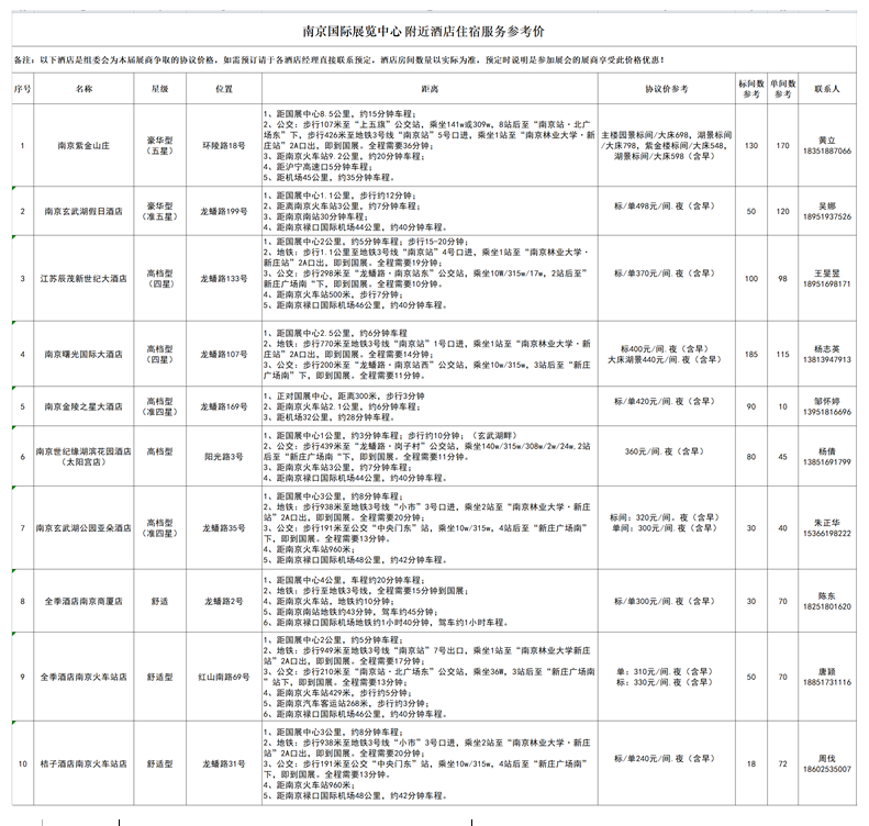 有关展览中心附近的酒店已经全部与大会组委会签署了服务协议,您在预订酒店时请标明是参加本届展会的,这样您就能够得到更为优惠的价格和更为周到的服务,您也可以致电大会组委会,由组委会工作人员代为预订房间。